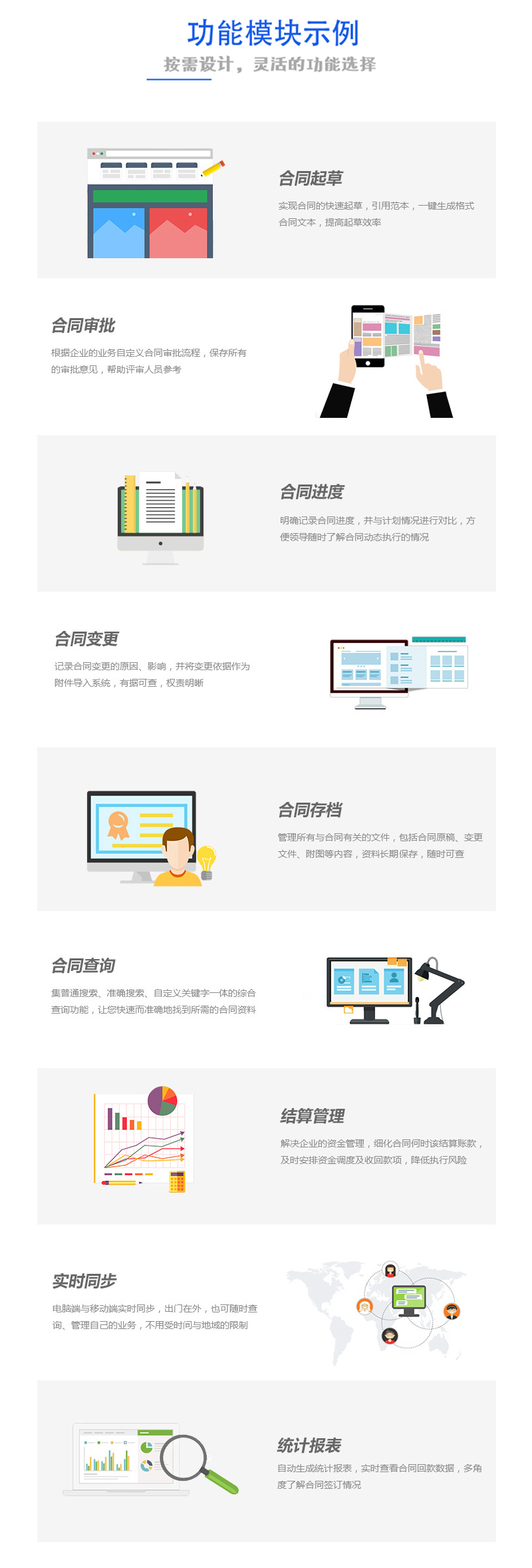 5)合同存檔:管理所有與合同有關(guān)的文件,包括合同原稿、變更文件、附圖等內(nèi)容,資料長期保存,隨時可查;